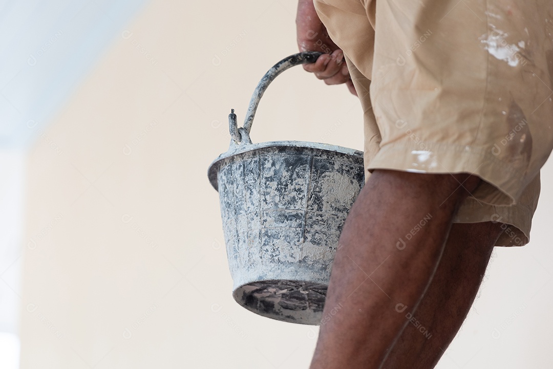Close-up de balde de tinta preta e pernas de pintor. Arquitetura.