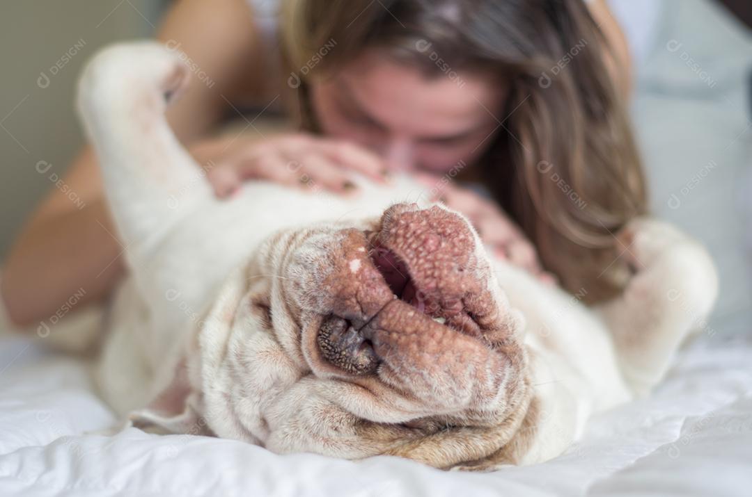 Linda mulher dormindo na cama com cachorro bulldog inglês.