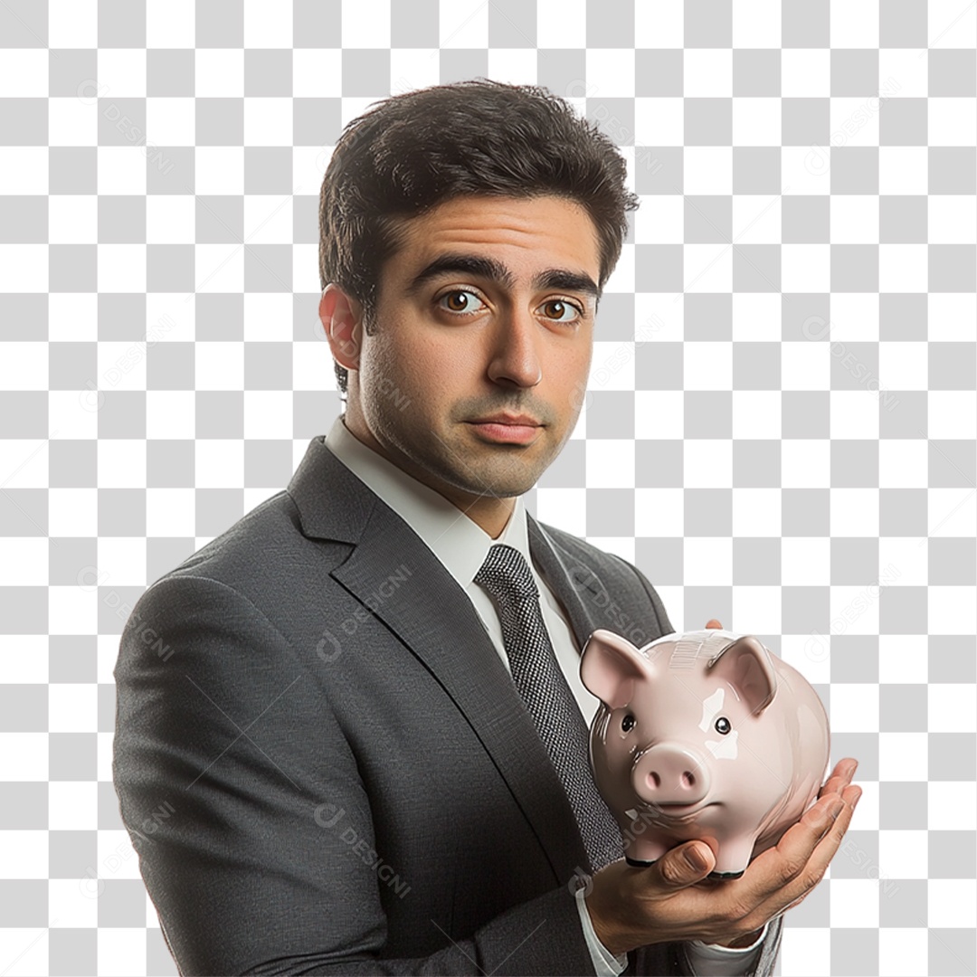 Homem Empresário com Cofre de Porquinho nas Mão PNG Transparente