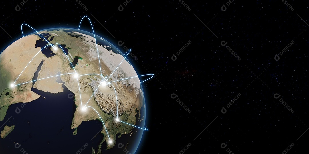 Conexões ao redor do planeta Terra vistas do espaço à noite, cidade...