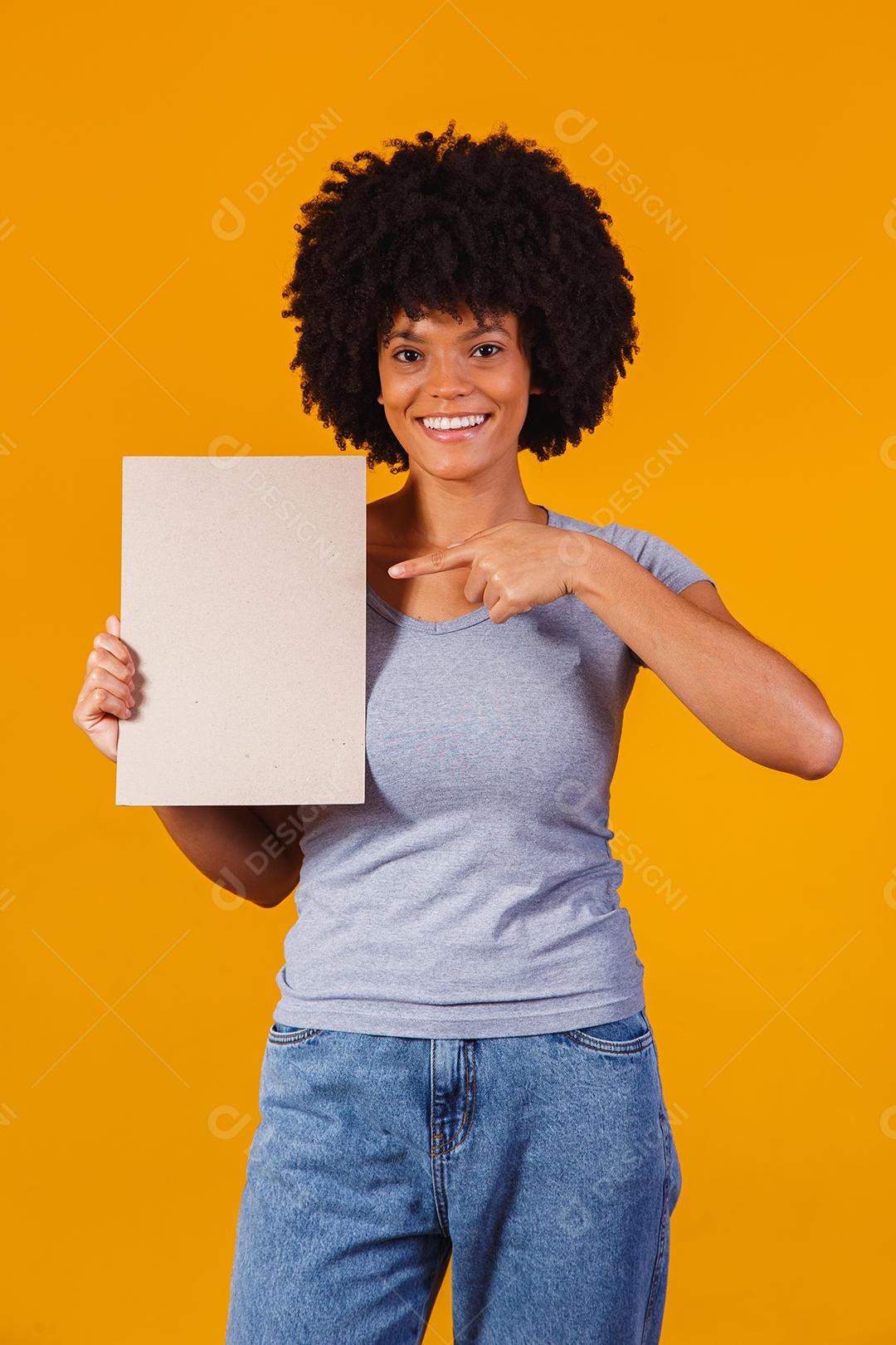 Mulher mostra tabuleiro vazio. Placa de publicidade. Sexta-feira preta. Publicidade. Mulher sorridente detém