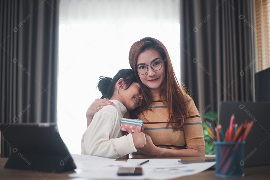 Feliz Dia das Mães. Mãe jovem recebendo parabéns