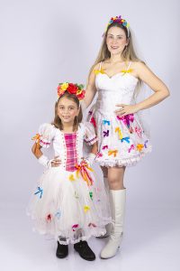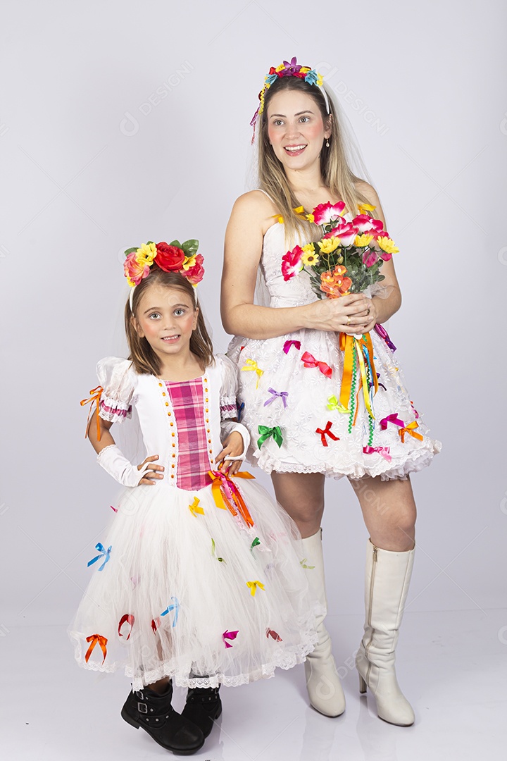 Jovem Mãe ao lado de sua filha sobre fundo isolado branco