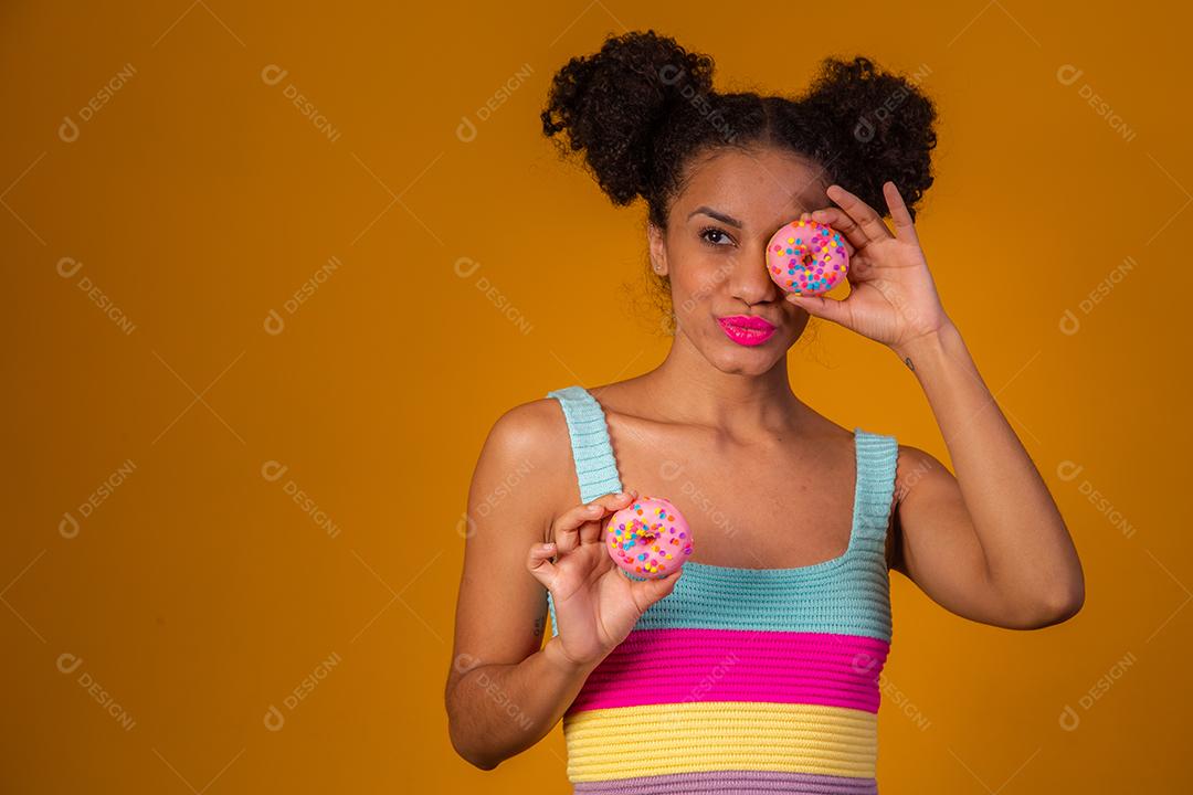Linda Garota Afro segurando Donuts Coloridos