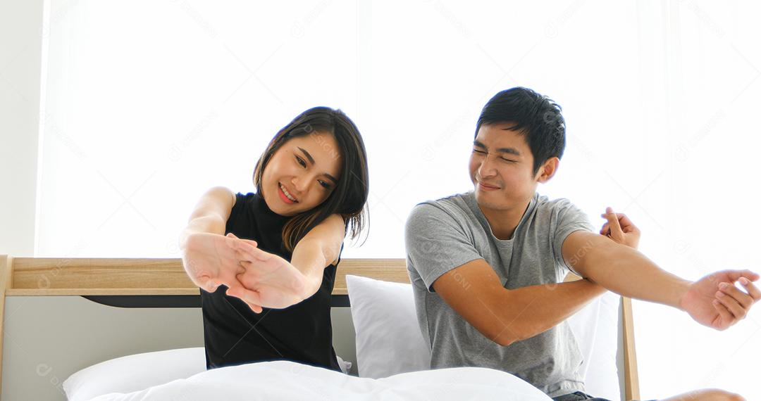 Amante de casais asiáticos acordando em sua cama totalmente descansado de manhã