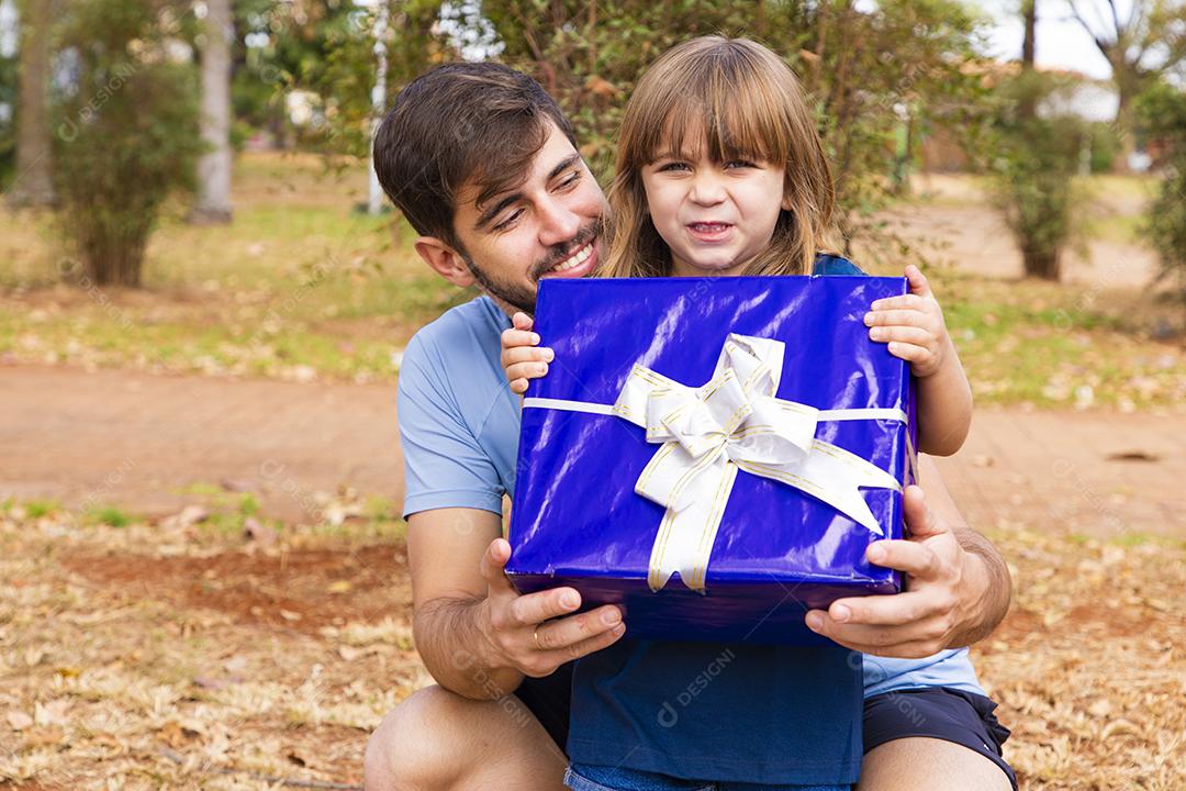 Este presente é para você. Retrato de menina amorosa ao lado do pai...