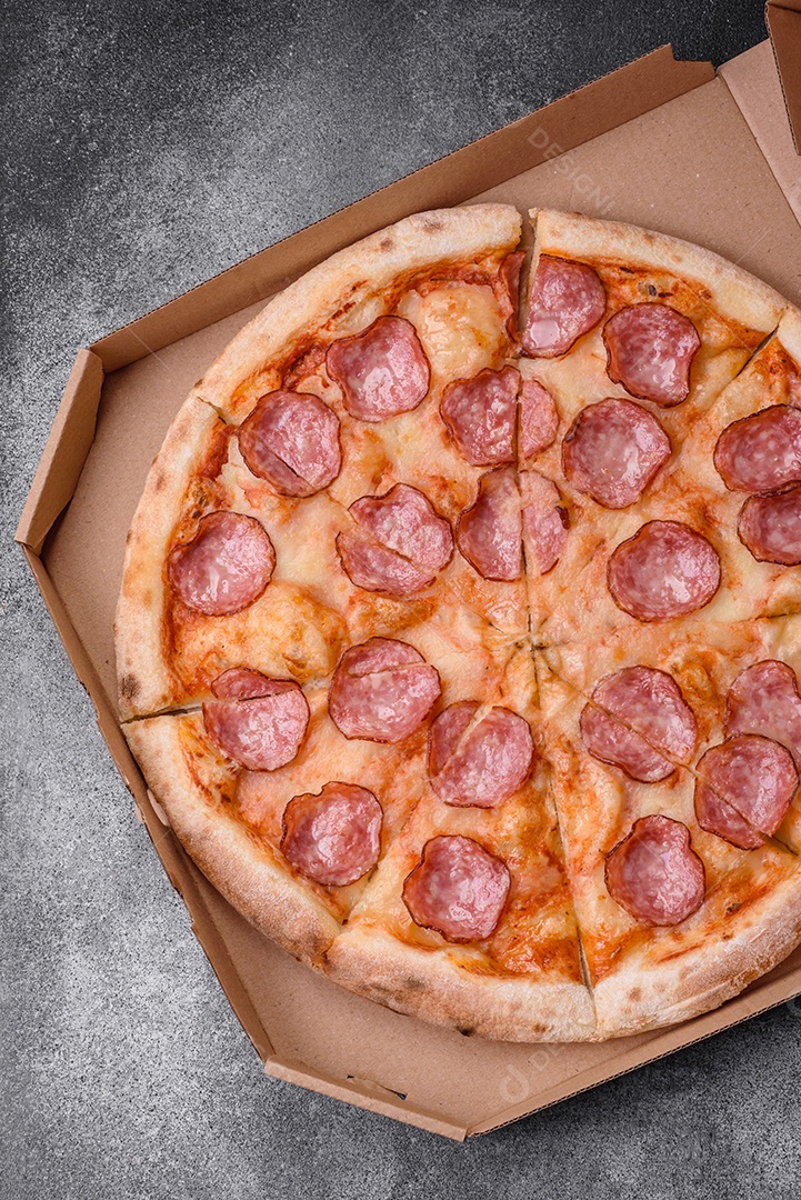 Saborosa pizza fresca com salame, queijo, tomate, especiarias e sal...