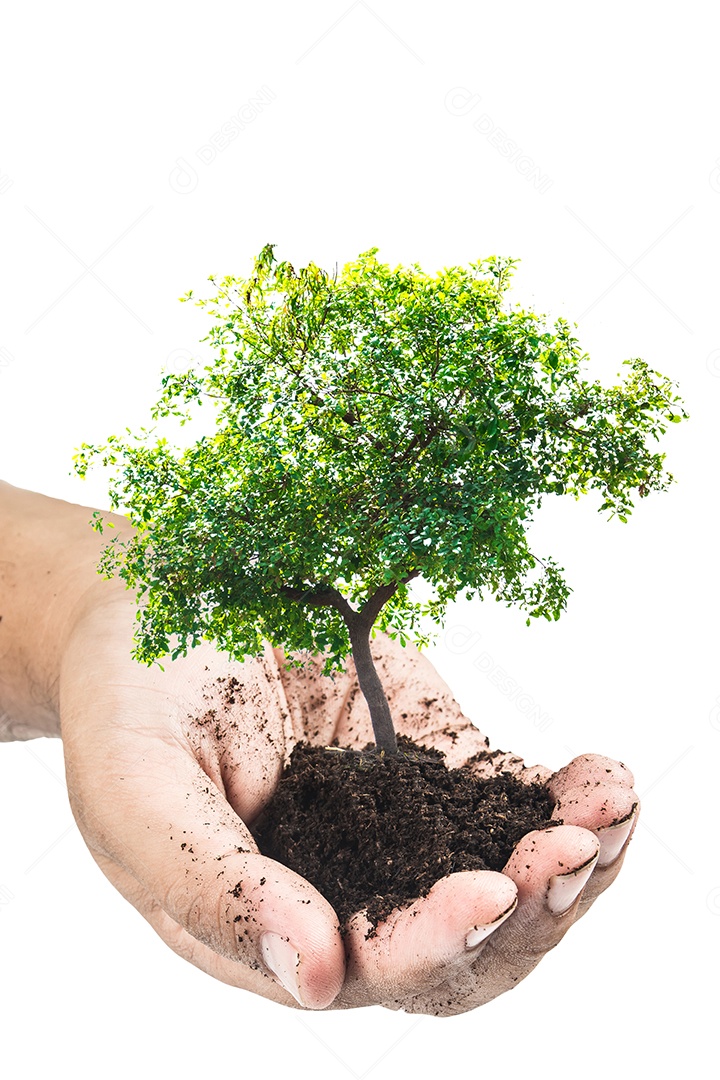 Mãos segurando uma planta jovem verde, pequena árvore isola o fundo...