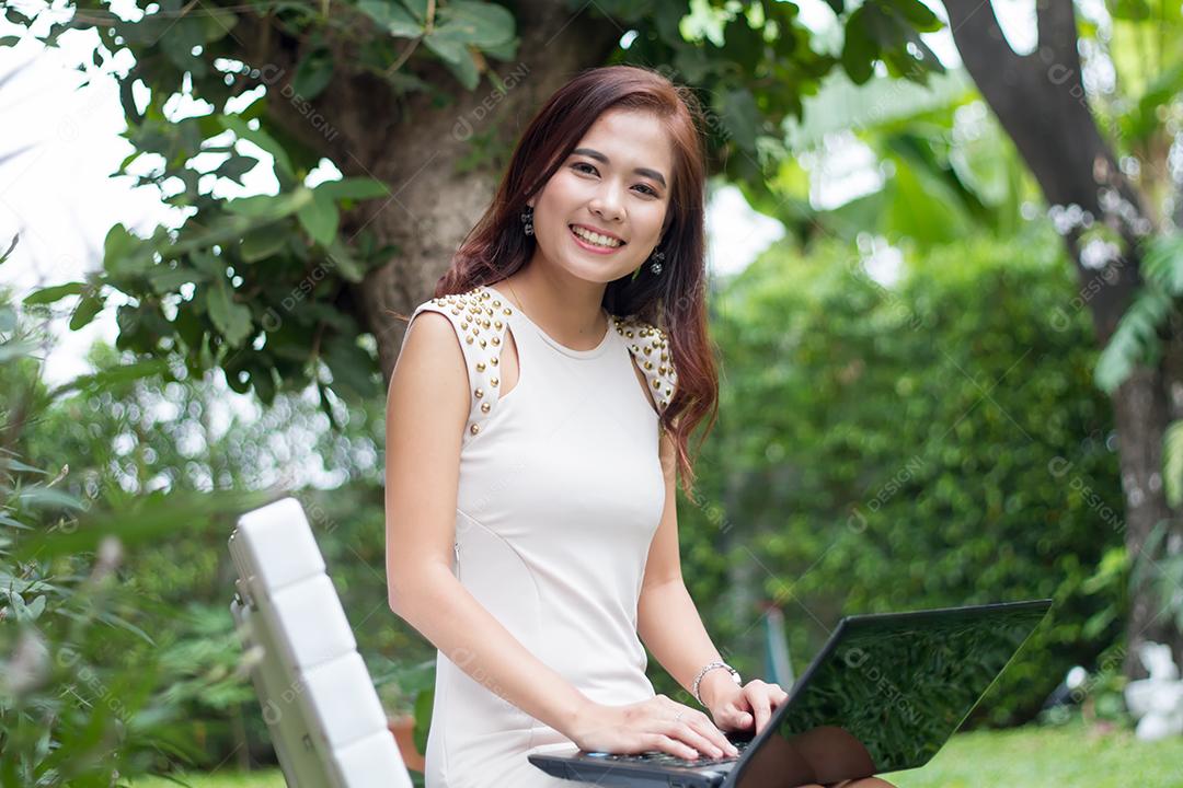 Mulheres de negócios asiáticas usando notebook e mulheres de negóci...