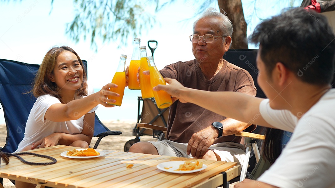 Grupo de pessoas familiares acampando na praia bebendo refresco de suco juntos