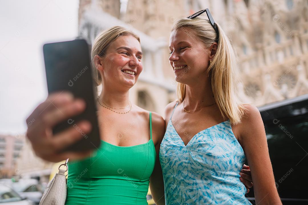 Amigas felizes aproveitando sua viagem em Barcelona segurando um mapa.