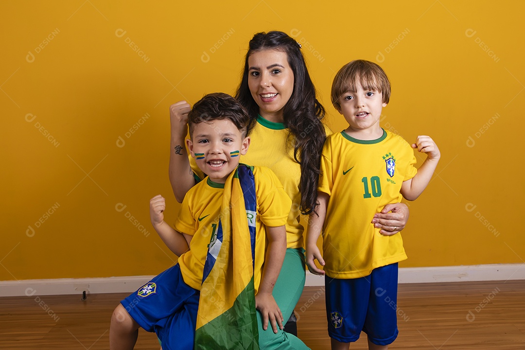 Mãe ao lado de seus filhos torcedores torcendo para o brasil copa d...