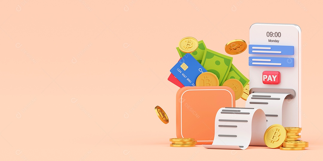 Fazendo transação com carteira bitcoin em aplicativo móvel, ilustração 3d