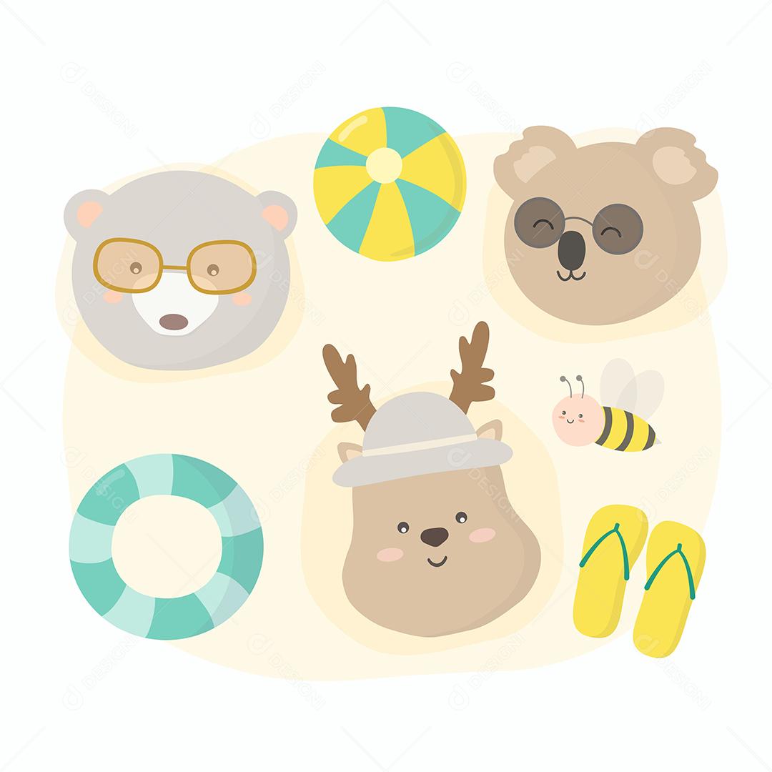 Rosto de urso, coala e veado com ícone de equipamento de abelha e praia para férias de verão, ilustração vetorial plana estilo desenhado à mão, personagem de desenho animado no conceito de horário de verão