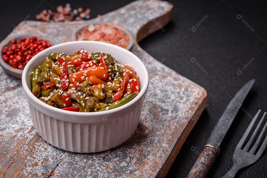 Mistura de legumes, milho, cenoura, pimentão, brócolis, cebola em molho teriyaki em uma placa de cerâmica sobre um fundo escuro de concreto