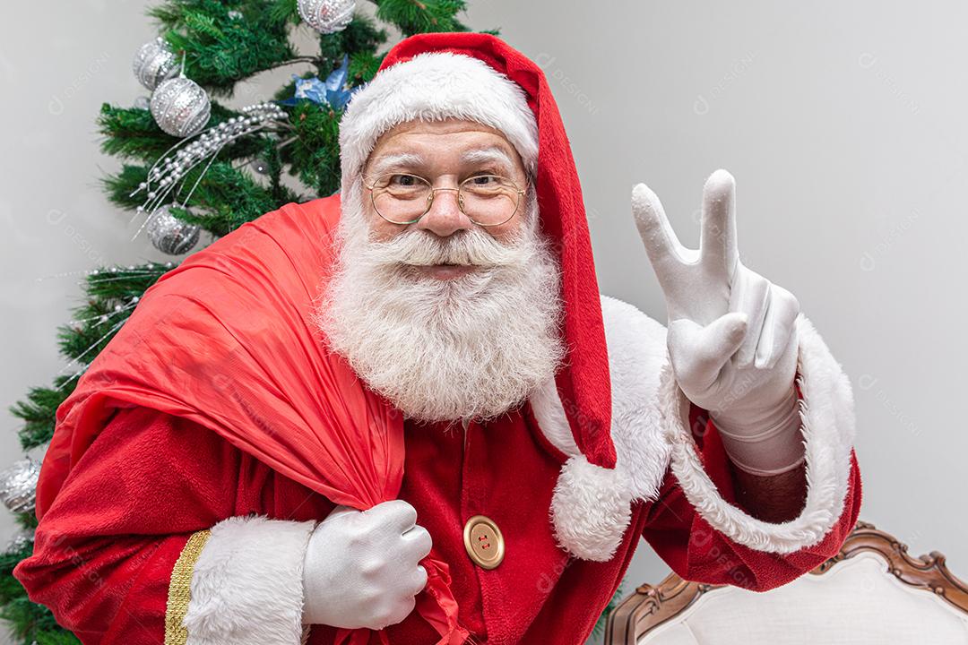 Papai Noel fazendo fotos de selfie. Noite de Natal. Entrega de presentes. Sonhos encantados de crianças.