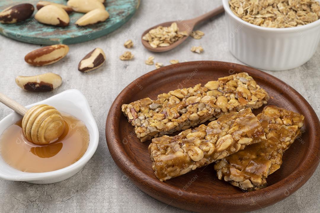 Barras caseiras de cereal com nozes, granola e mel