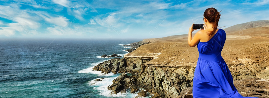 Mulher vestida de azul tira uma foto à beira-mar das falésias na costa da ilha de Fuerteventura - Ilhas Canárias - Espanha
