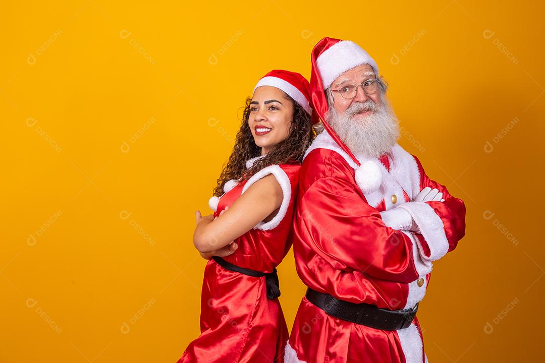 Feliz Natal. Jovem noelete e verdadeiro Papai Noel sorrindo olhando...