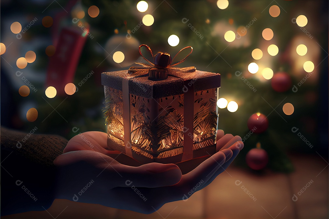 Mão segurando um presente Há uma árvore de Natal decorada ao fundo com luzes