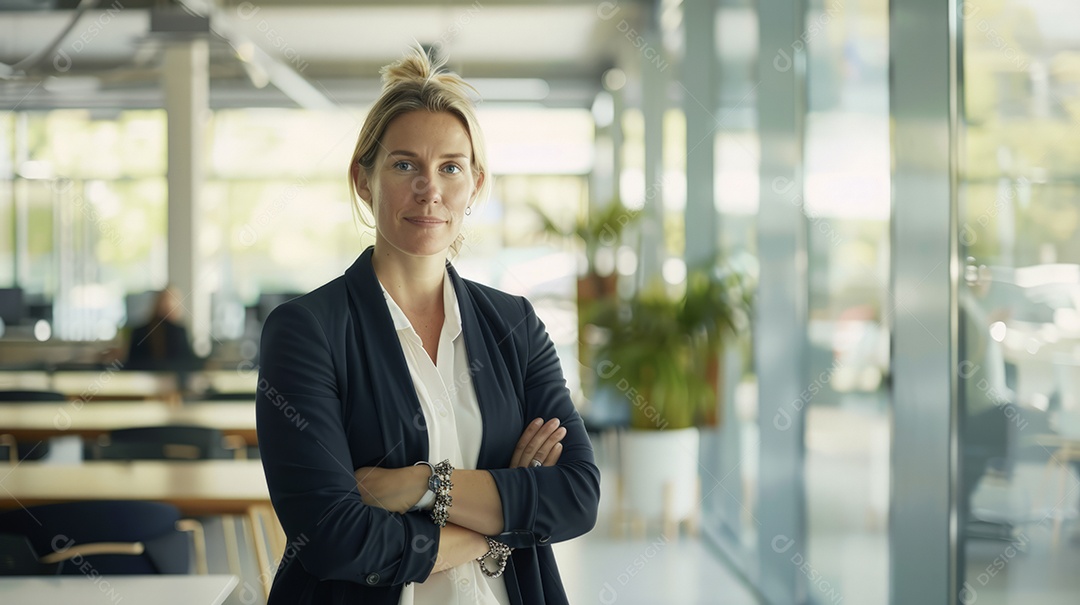 Profissional de RH em um escritório corporativo moderno cercado por...