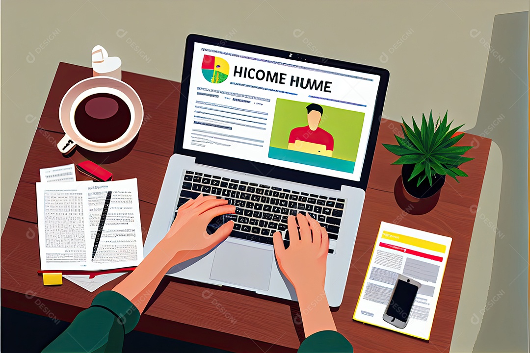 Trabalho à distância, trabalhando no conceito de casa. Mão de homem...