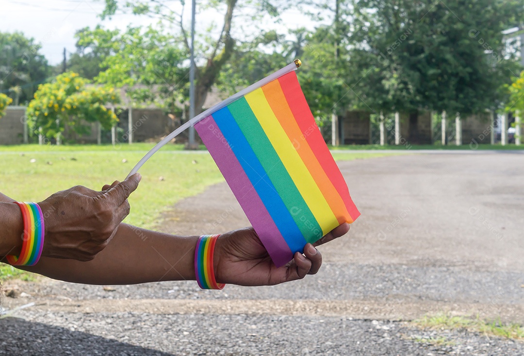 Mãos gays asiáticas ou tailandesas estão usando uma faixa lgbtq+ e segurando a bandeira do arco-íris