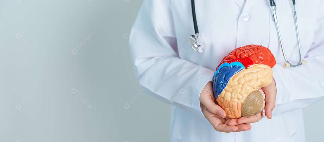 Médico segurando modelo de cérebro humano. Dia Mundial do Tumor Cer...