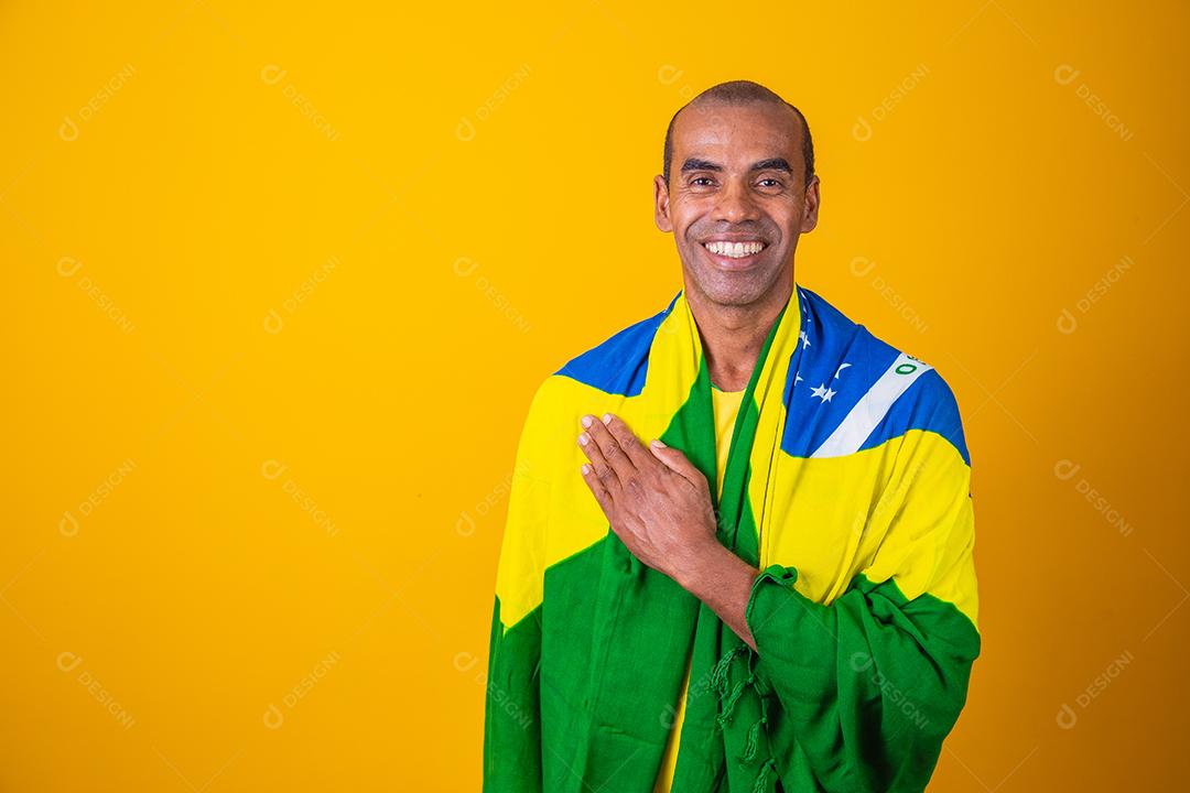 homem afro brasileiro bonito. Fã brasileiro. Copa do Mundo 2022, mão no peito cantando o hino nacional. Música brasileira. amada pátria. patriota.