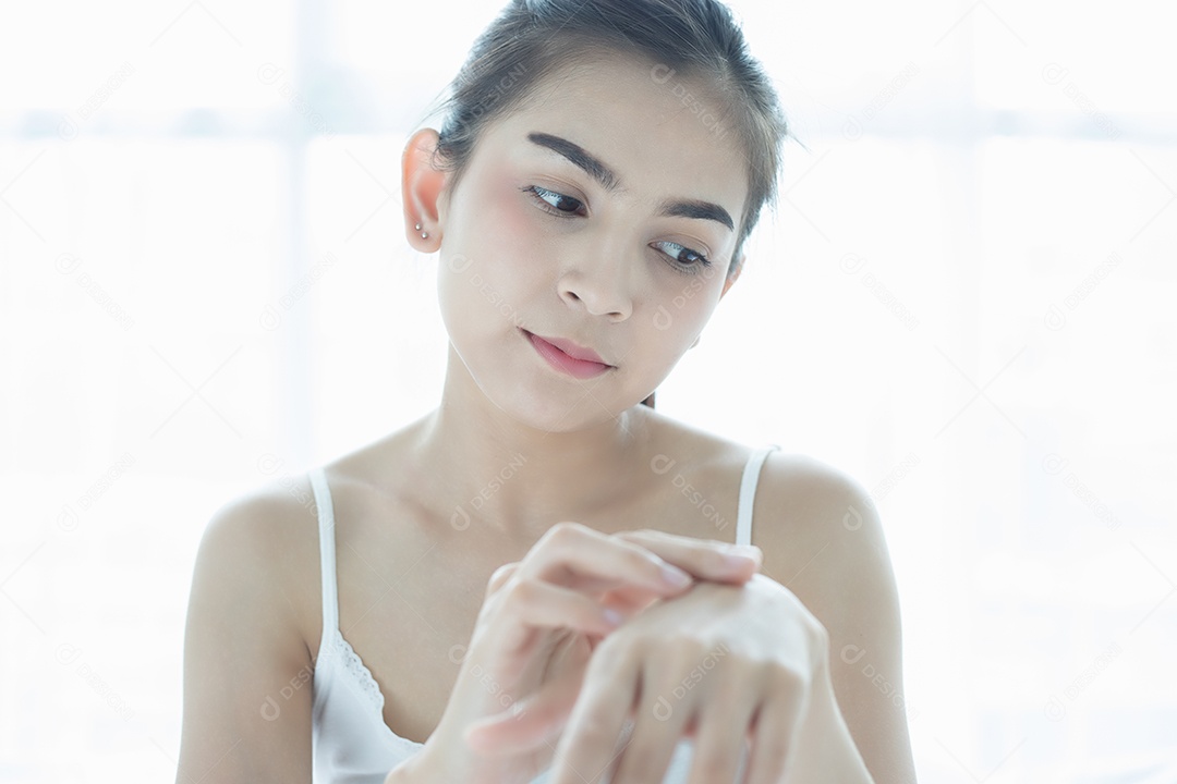 Mulher asiática usando um produto de cuidados com a pele, hidratante ou loção cuidando de sua pele seca. Creme hidratante