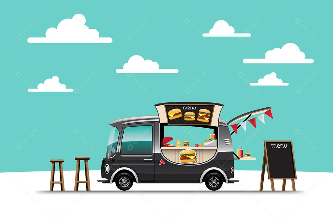 A vista lateral do caminhão de comida com menu de hambúrguer e cadeira de madeira, hambúrguer de banner em cima do carro, ilustração vetorial