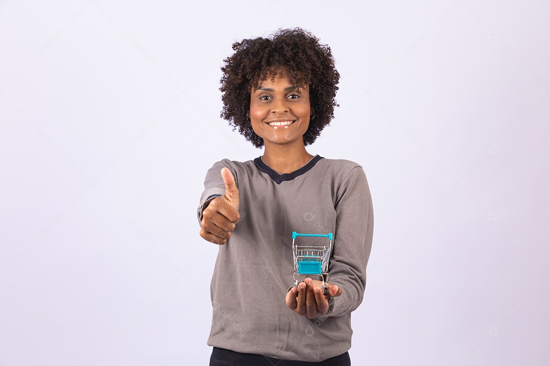 Linda mulher garota jovem cabelo afro segurando carrinho de compras