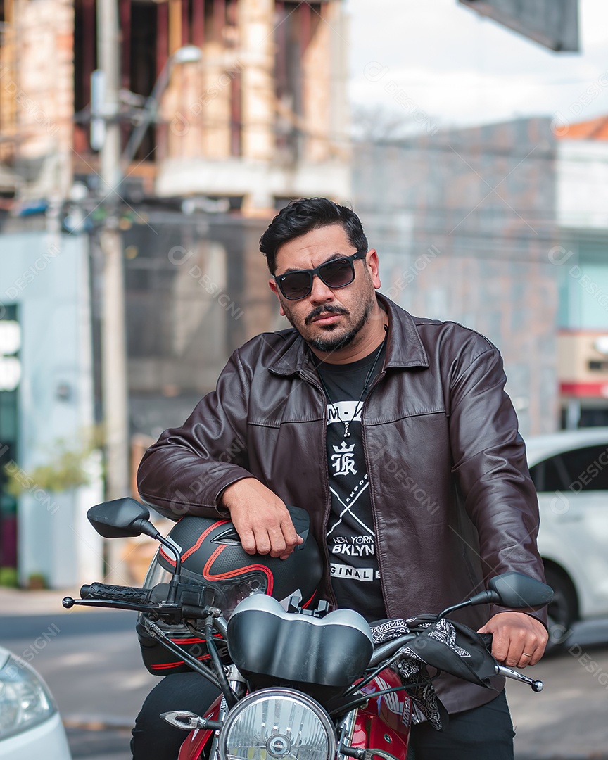 Homem de meia idade bonito em cima de uma moto posando para foto