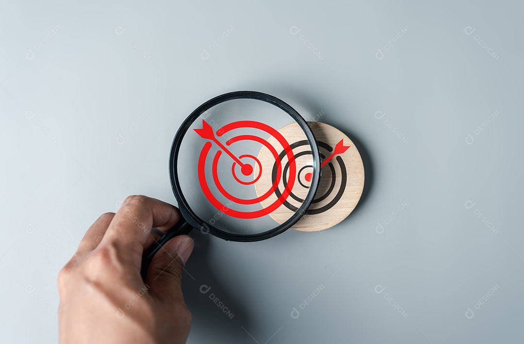 Lupa para direcionar o ícone da solução para alterar metas e resolver problemas de negócios.