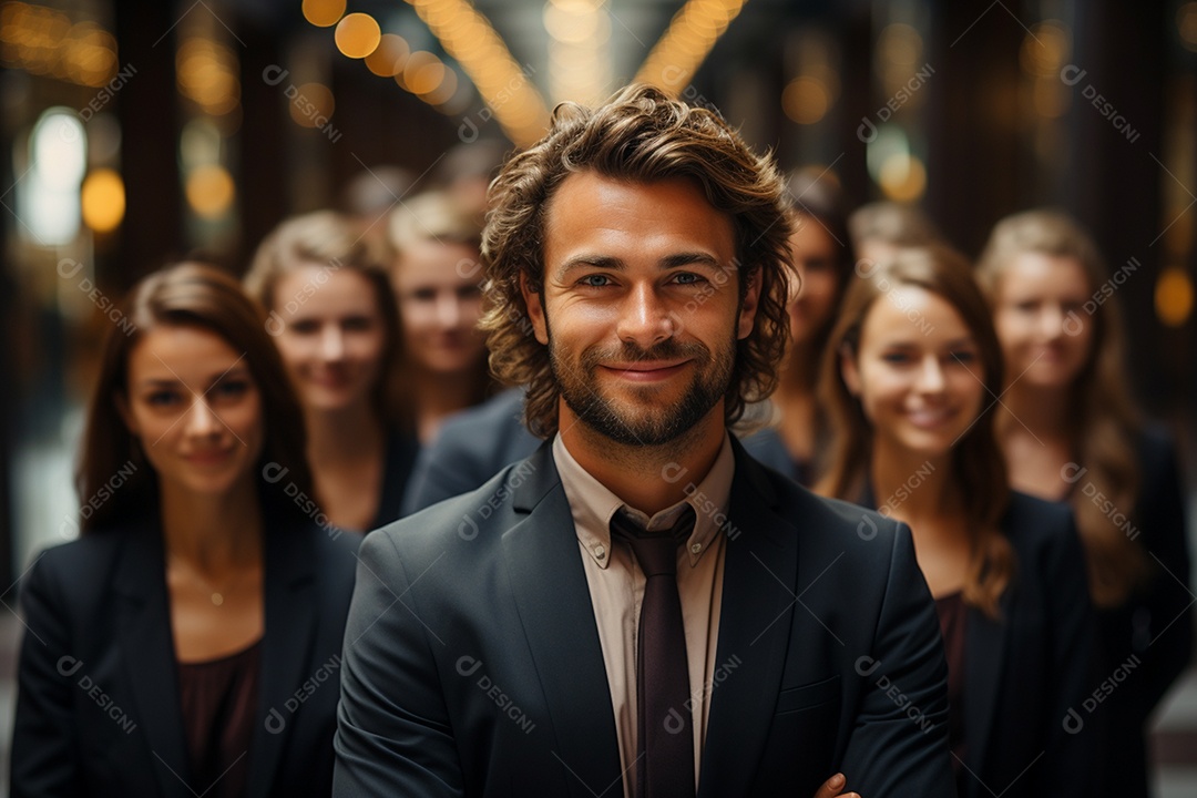 Retrato de uma equipe de negócios rindo em pé no escritório