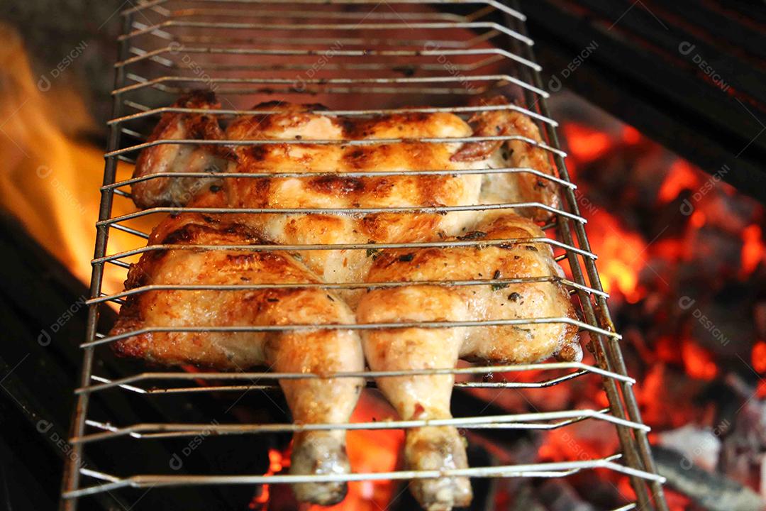 Frango inteiro grelhado em um churrasco. Comida brasileira JPG
