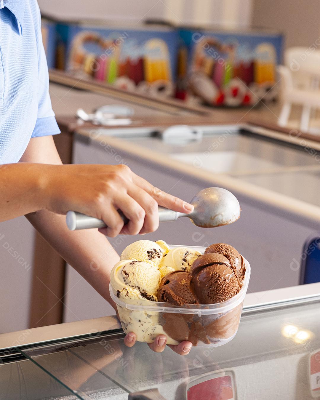 Mão de mulher colocando sorvete cremoso no pote para levar para casa.