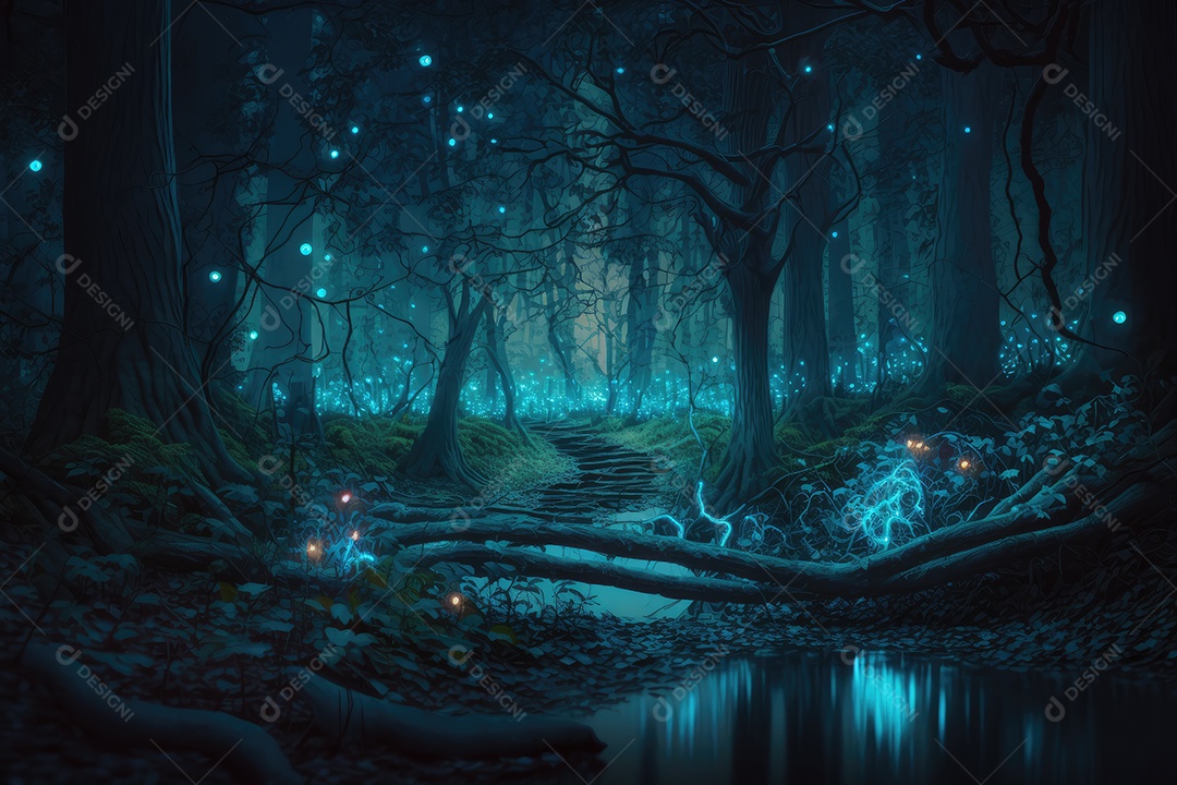 Floresta encantada de conto de fadas iluminada por grandes árvores ...