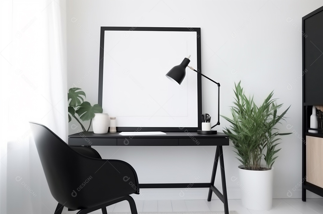 Maquete de quadro vertical, tela vazia em branco isolada no fundo branco do escritório em casa. Copie o espaço.