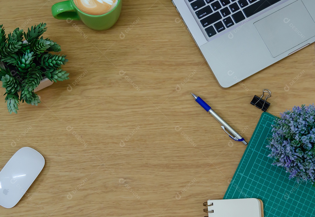 Vista superior do computador portátil, rato, flor, bloco de notas e...