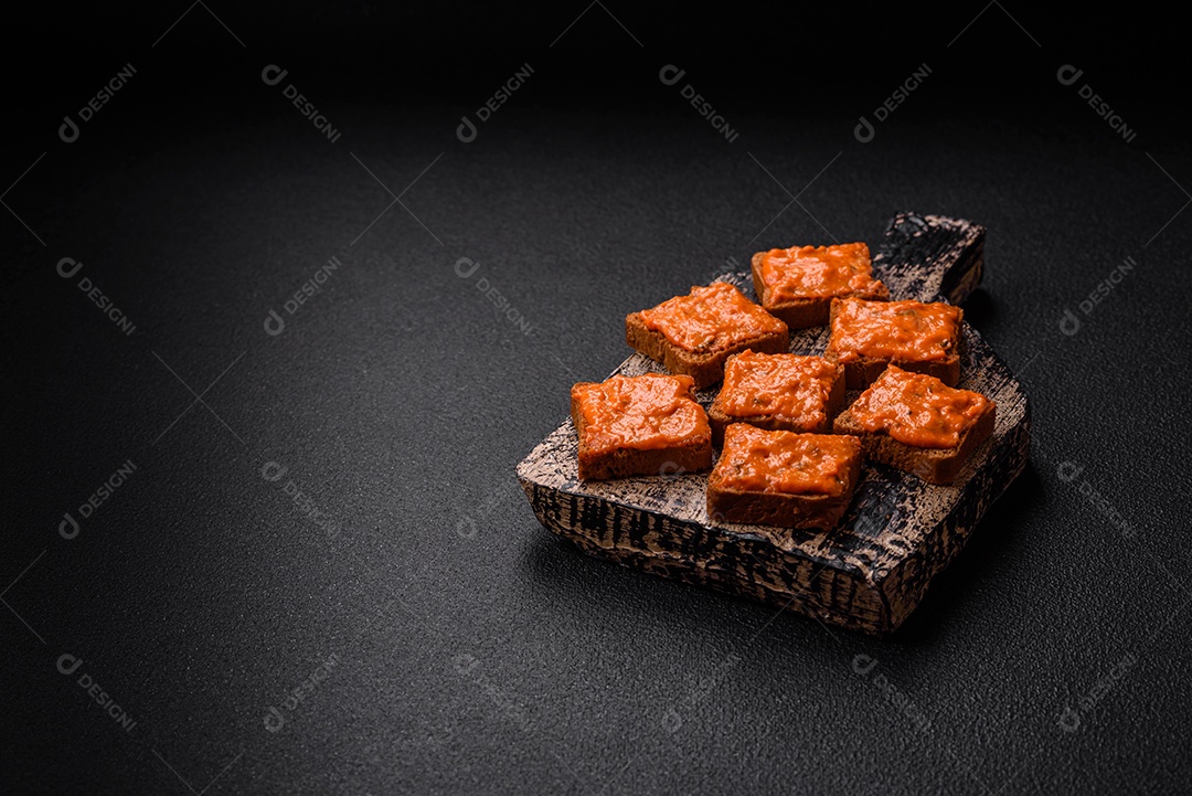 Delicioso sanduíche composto por torradas, molho vermelho com sal, especiarias e ervas sobre um fundo escuro de concreto