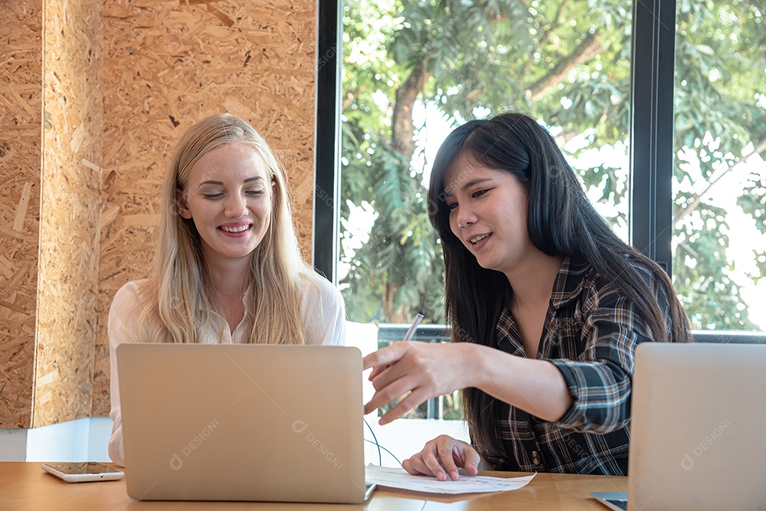 Mulheres de negócios usam computador portátil no local de trabalho.