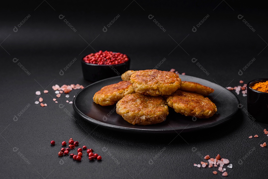 Delicioso prato vegetariano ou vegano em forma de costeletas ou hambúrgueres consistindo de batatas, cenouras, cebolas e feijões sobre um fundo escuro de concreto