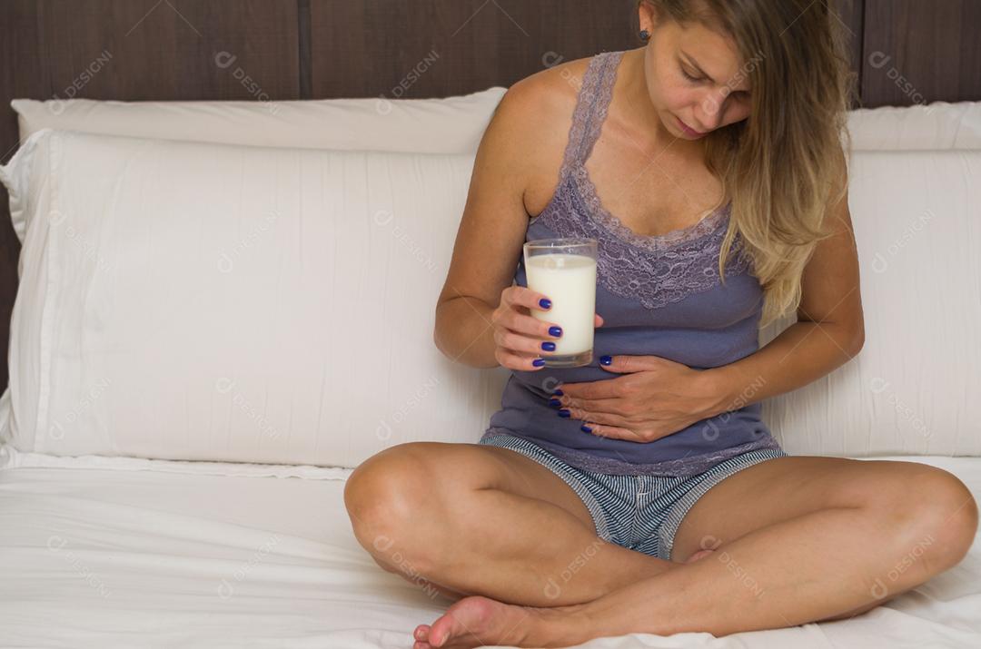 Grande conceito de alergia alimentar, alergia ao leite, lactose, mulher má com leite.