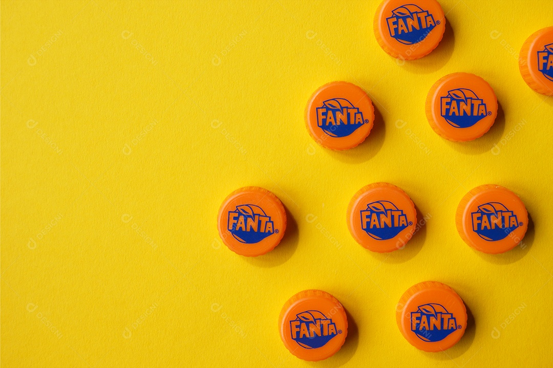 Várias tampas de garrafa pet da Fanta sobre fundo amarelo