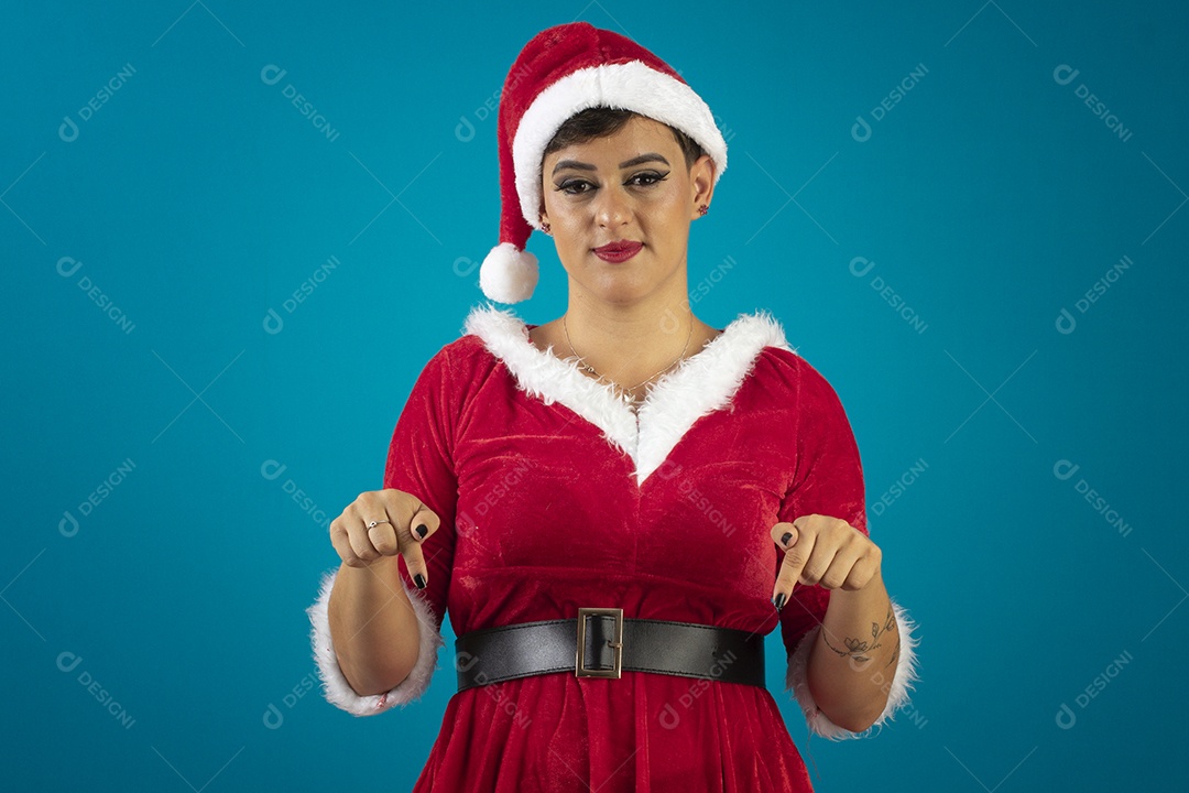 Mulher jovem com roupa de Mamãe Noel e chapéu