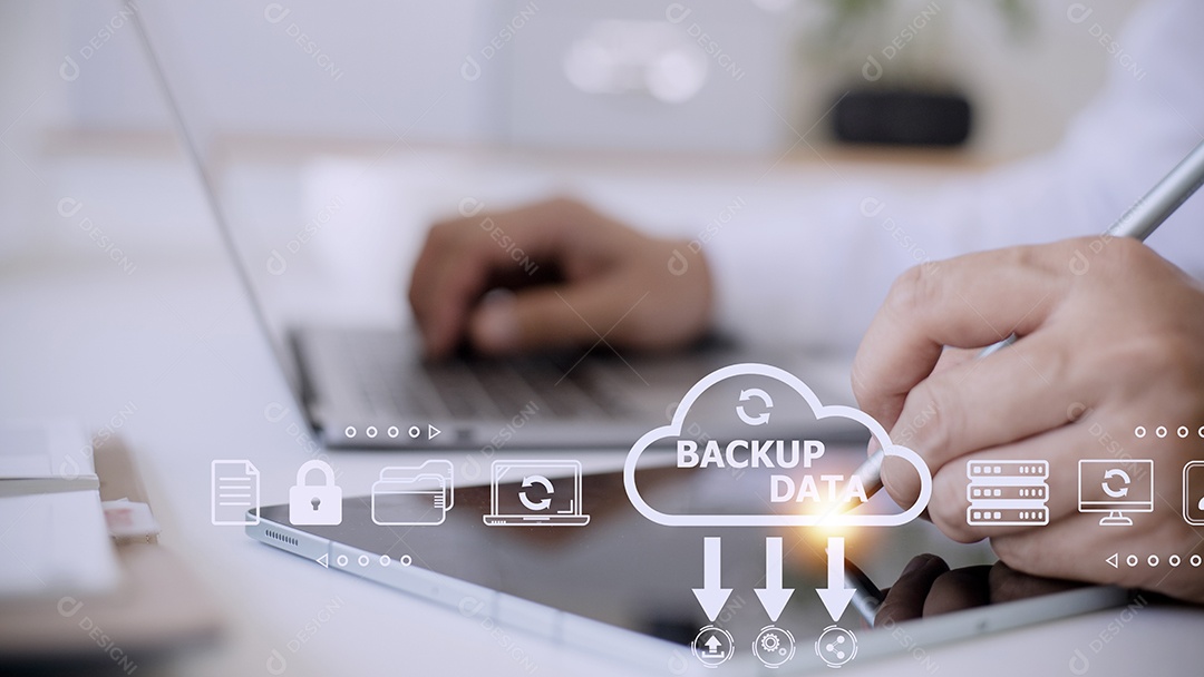 Empresário usando um computador para fazer backup de dados de armazenamento Internet tecnologia