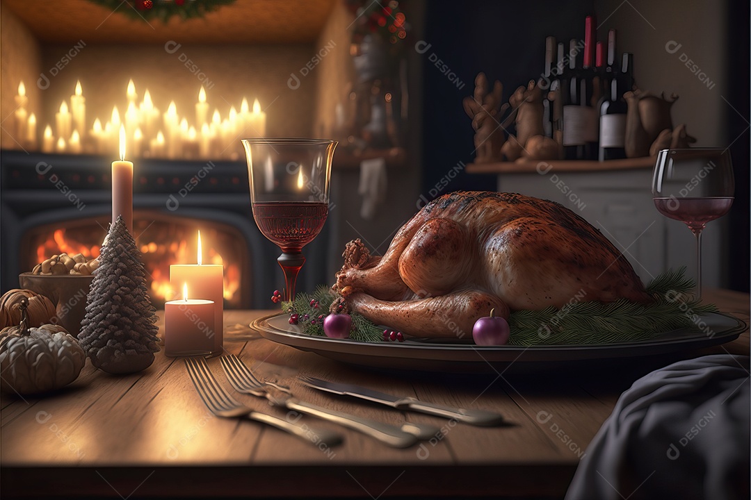 Peru assado suculento e saboroso no prato com decoração de Natal.