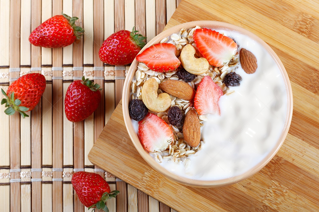 Iogurte natural com granola caseira morangos e nozes em tigela de cerâmica