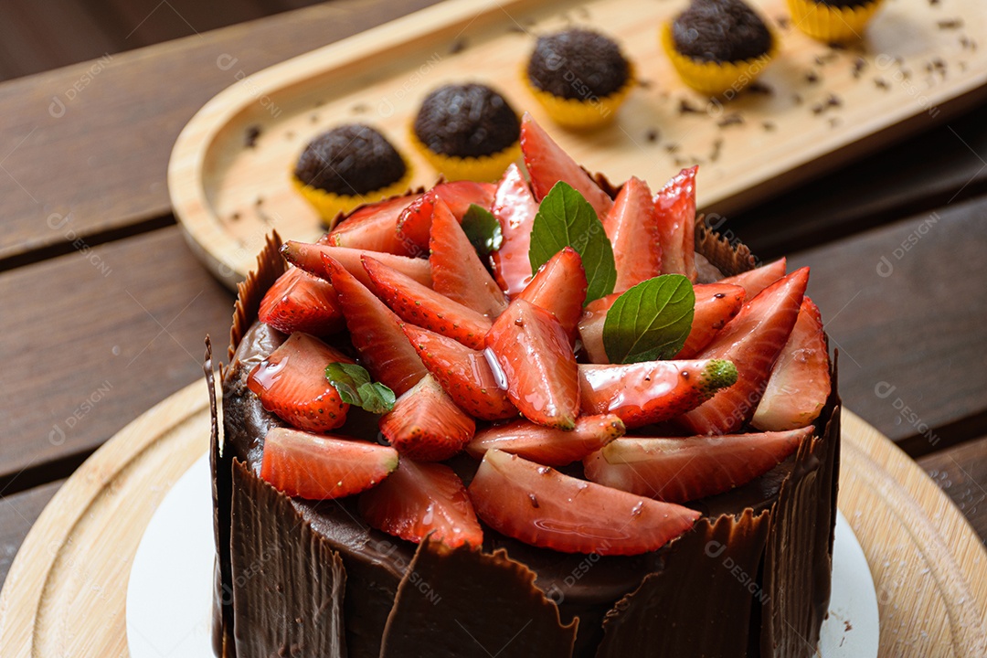 Bolo de chocolate sendo decorado coberto com morangos, folhas fresc...